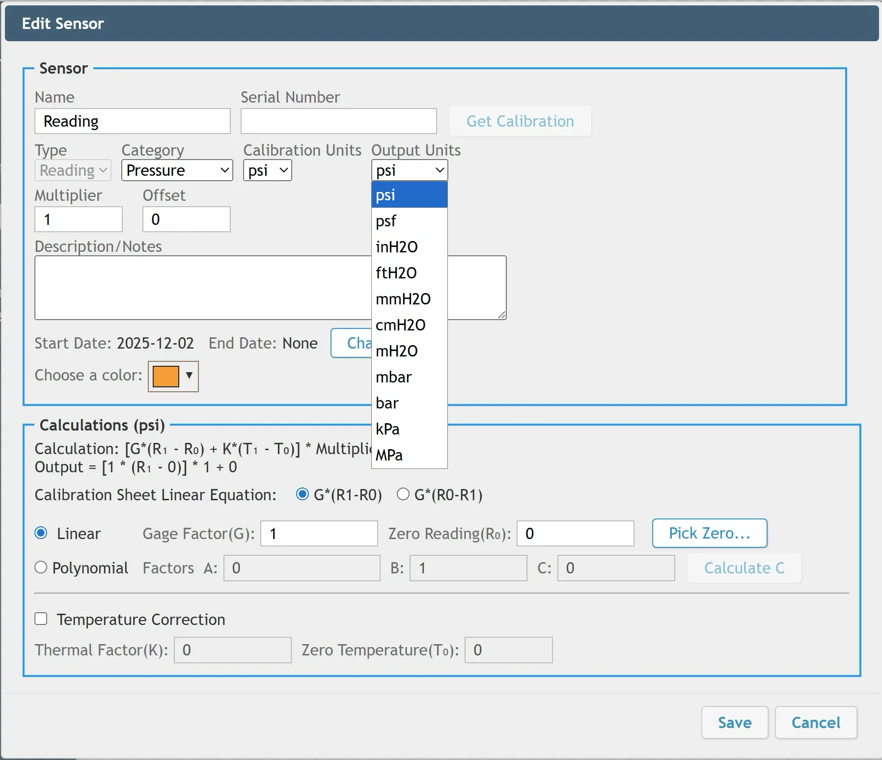 (讀值 – 初始值1) x 係數2 = P壓力。(kPa 或 psi)