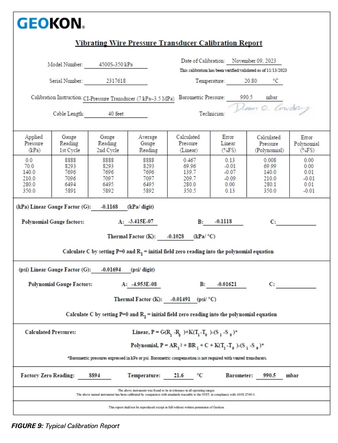 GEOKON 振弦式水壓計在量測時所得到的僅是感測器的原始振頻或數位讀值,若要轉換為實際的水頭(水深),必須依照儀器校正報告與操作手冊進行一系列換算與修正程序,包括壓力換算、溫度修正以及大氣壓力修正等步驟,方能獲得準確且可使用的水位資訊。