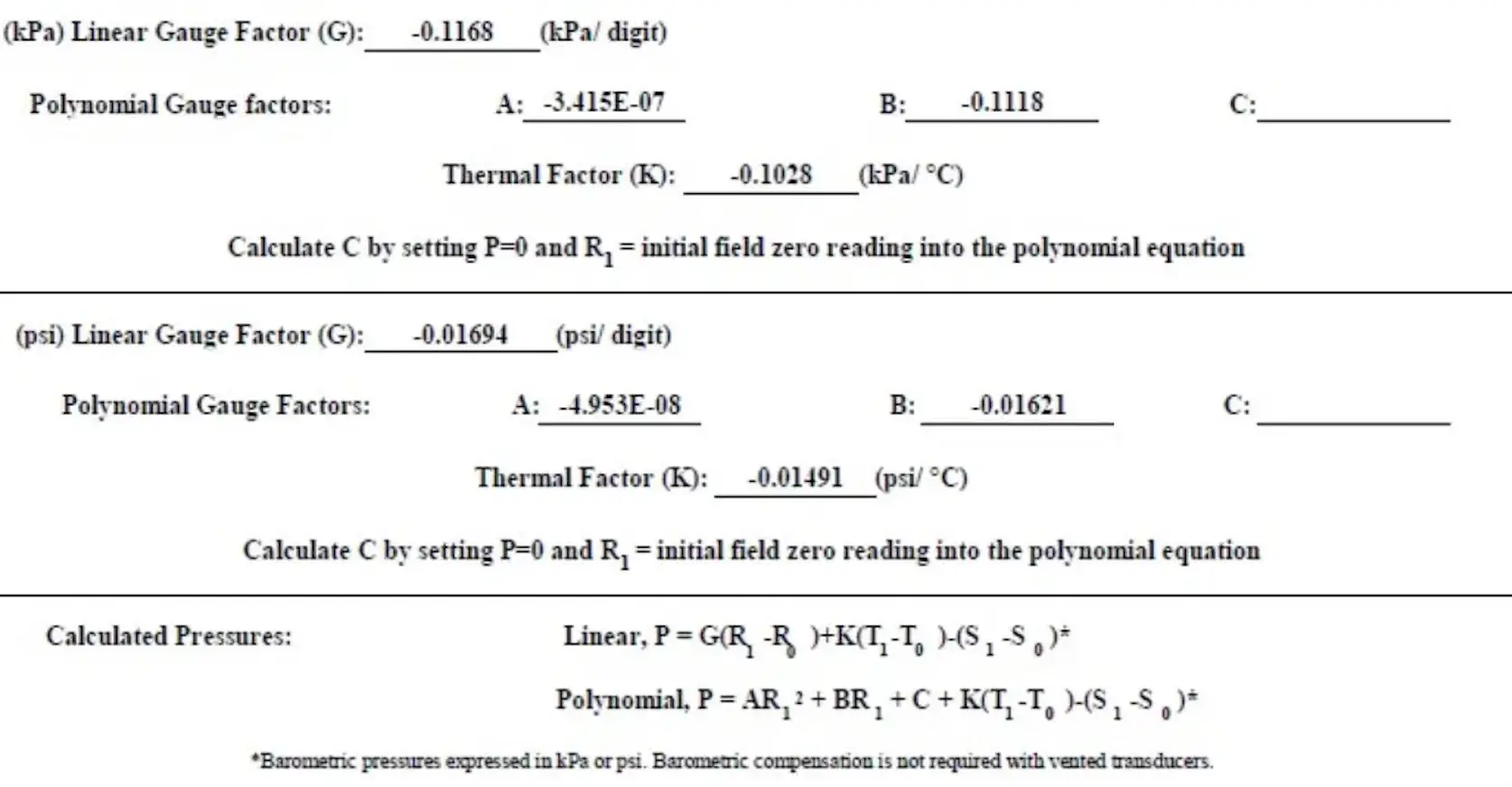 請注意: 若使用kPa 單位計算, 使用的 Gauge Factor (G) 數值與 psi 的Gauge Factor (G)不同。