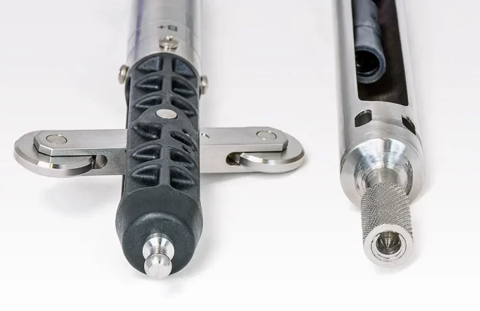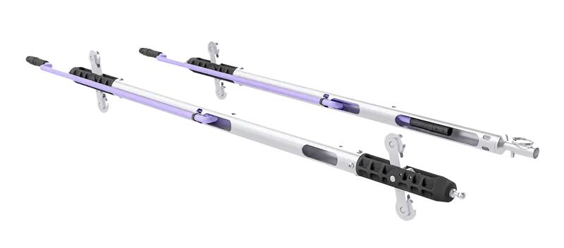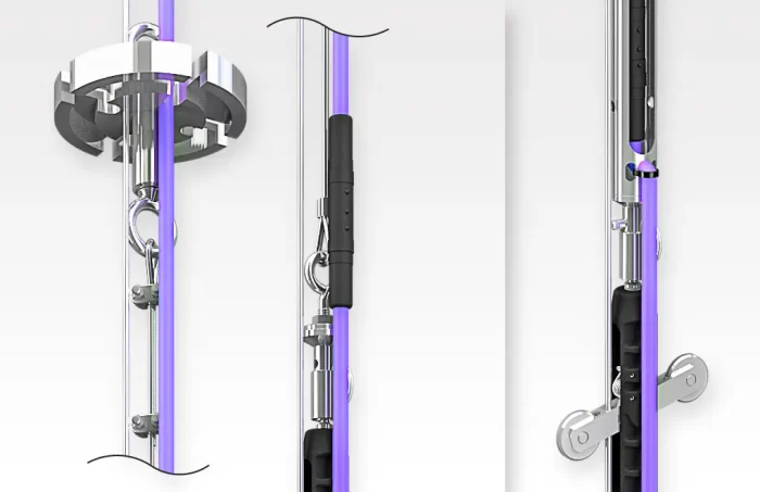 型號 6180T 雙輪感測器(前端)包括一個集成的終端器,並且最先安裝。隨後的型號 6180 感測器(後端)通過直列式球形接頭連接,每個感測器內含熱敏電阻來讀取溫度。型號 6180 直列式球形接頭與輪組的特寫圖,這些裝置將感測器置於管殼的中央,允許在管殼內無阻礙地進行相對運動,並適應任何管殼的螺旋扭曲。型號 6180 懸吊支架、電纜和接收器(左側)以及直列式球形接頭連接的特寫圖。四針防水電纜接頭的特寫圖。