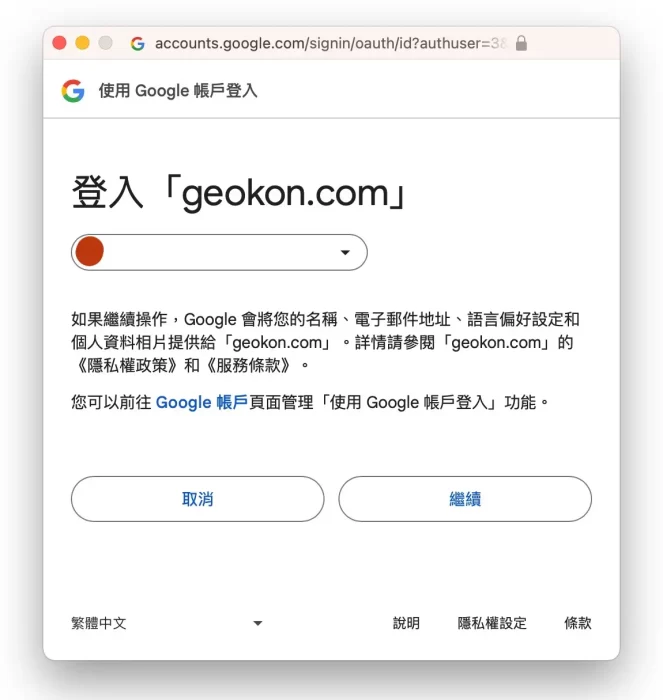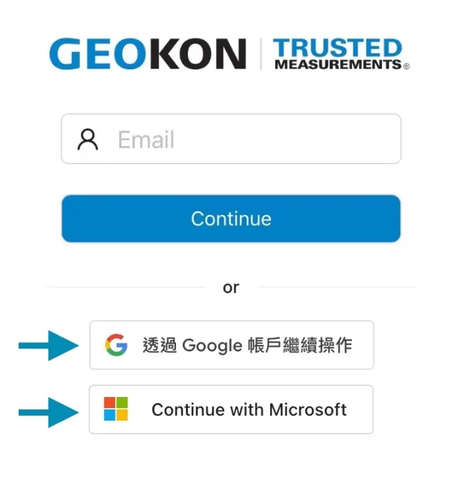 *使用者必須已有一個可用的Google 帳號/微軟Microsoft帳號, 接下來用這個帳號來登入, 按下 “透過Google 帳號繼續操作” 或 “Continue with Microsoft” 後將會跳出登入的視窗, 透過登入該帳號後會自動連動你的Google 或微軟帳戶作為登入GEOKON OPENAPI 平台的方法。